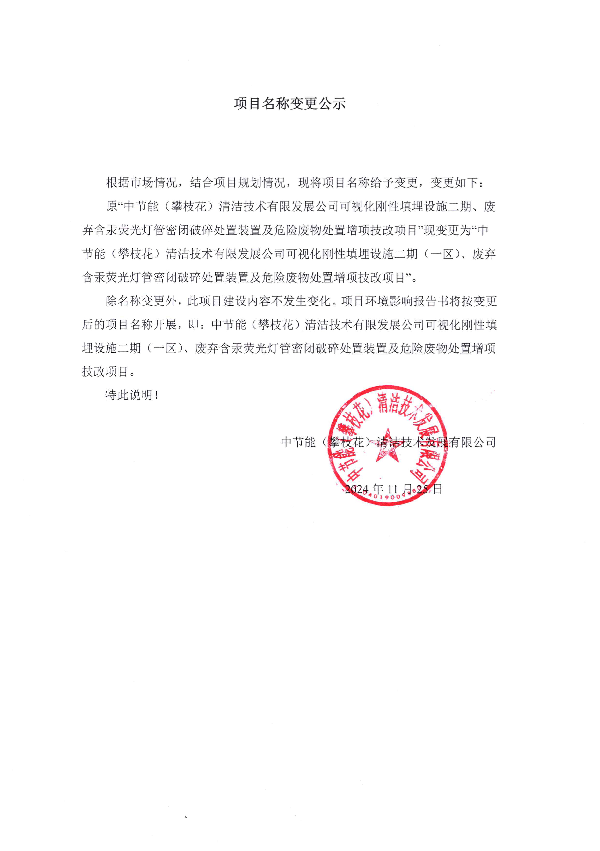 中節(jié)能(攀枝花)清潔技術(shù)發(fā)展有限公司關(guān)于項目名稱變更公示